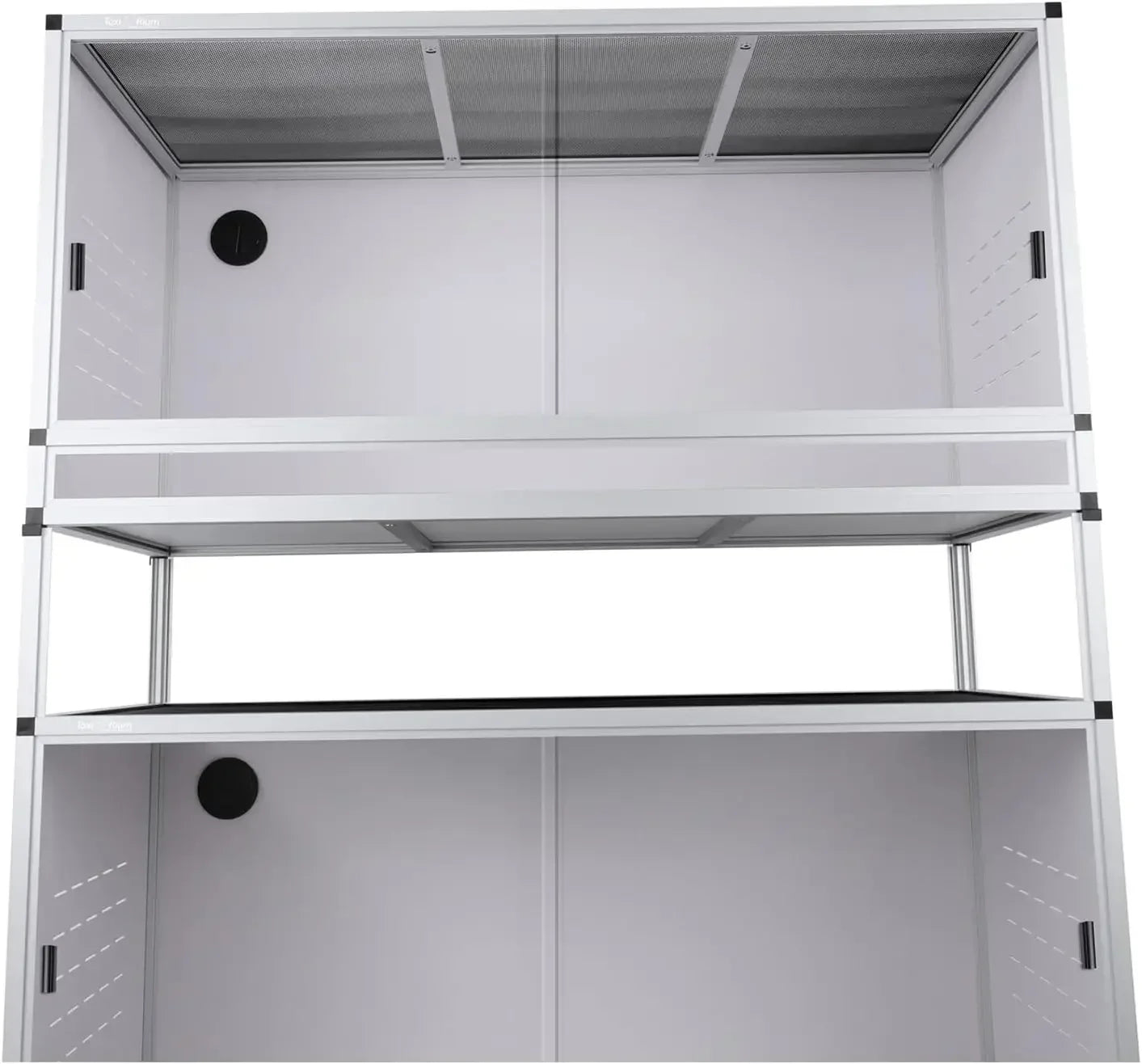- Ventilation is built in with side vents and a top mesh screen to support foggers, UV/heat lamps, infrared lighting, and consistent humidity control.